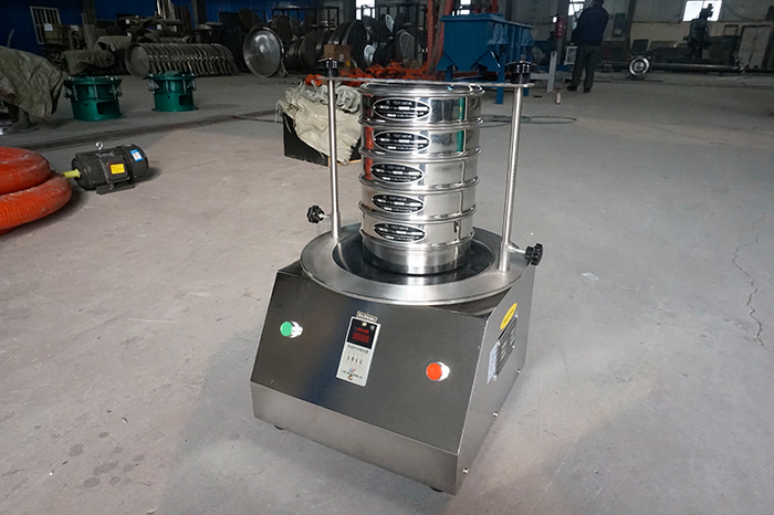 試驗篩機是以YZU立式振動電機作為整機振動源,通過振動電機帶動上部振動盤振動,再通過振動盤傳導至安放在振動盤上部Φ200篩框上,然后由需要檢測目數的篩框把小于篩網孔徑的物料顆粒篩分至下層篩框,如此層層篩選,使每層試驗篩內只留相同粒度的物料,達到不同粒度的分離并確定此物料的粒度組成,使Φ200型篩框中的物料能非常有效的起到過濾、分級、篩分目的。